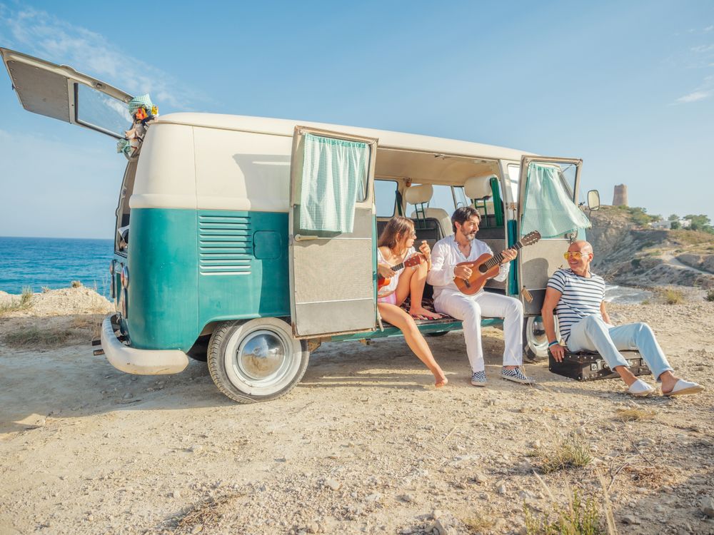 Joyful relaxed people enjoying playing ukulele and guitar sitting near trailer at dusty seaside on background of amazing water in bright day
