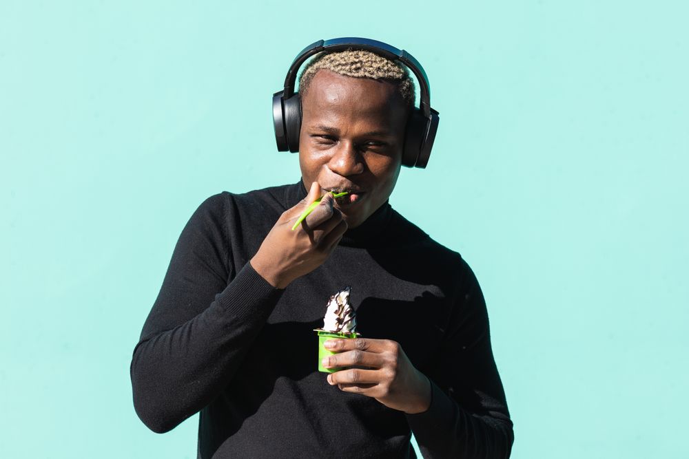 Content young Black male millennial in casual clothes listening to music in headphones and eating tasty ice cream against blue background on sunny day